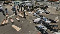Soldados libaneses preparan ataúdes para las víctimas de los bombardeos israelíes en la ciudad de Tiro