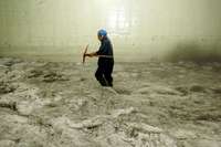 Un trabajador del GDF, en medio de una gran capa de granizo, realiza labores de desazolve en el paso a desnivel de Viaducto y Puente de la Morena, tras la tromba de anoche