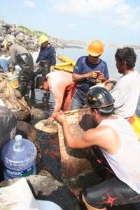 Funcionarios de la Procuraduría Federal de Protección al Ambiente (Profepa) evalúan el daño producido por el combustible, que impregnó un área de 150 metros de aguas marinas, en cuyas orillas anidan parvadas de pelícanos.