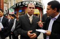 Mehdi Belyani, dueño del restaurante Bridge to China Town, habla con los medios de comunicación en Borough Road, en el sur de Londres, donde agentes detuvieron a 14 hombres después de incursiones de la policía contra grupos islámicos sospechosos de tener contacto con "terroristas". A la derecha, un uniformado custodia la allanada escuela secundaria Jameah Islamiyah