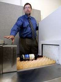 Pat Shea, jefe de operación de Rapiscan Systems Neutronics and Advanced Technologies, utiliza una botella de vino en su compañía de California para demostrar el sistema de detección de amenaza con líquido