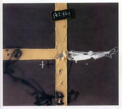 De ahí el relieve y las depresiones, las hinchazones y los salientes, las desgarraduras y las perforaciones que afectan a veces al propio lienzo y siempre delatan un impaciente deseo de transgredir la superficie. Entre el espacio y la materia se desarrolla un conflicto que un pacto frágil parece suspender, no resolver, y cuyas tensiones internas, en su inmovilidad silenciosa, sigue emitiendo una radiación de energía que nos alcanza, nos implica, nos hace vacilar de entrada frente a la evidencia plástica y poética del cuadro.