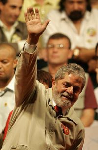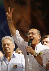 Luiz Inacio Lula da Silva, presidente de Brasil que buscará este domingo su relección en segunda vuelta, saluda a simpatizantes. Al lado, su rival, el socialdemócrata Geraldo Alckmin; ambos cerraron campaña ayer en la ciudad de Sao Paulo