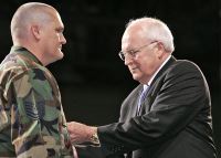 Una guardia de honor carga en Prattville el ataúd con los restos de un soldado estadunidense muerto en Irak. A la derecha, Dick Cheney condecora en Whiteman al sargento Mike Morin