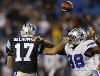 Greg Ellis, de los Vaqueros de Dallas, no pudo interceptar un pase alto del mariscal de las Panteras de Carolina en el juego de la NFL en Charlotte
