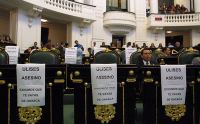 Durante la sesión de ayer de la ALDF, diputados colocaron pancartas con la exigencia de que renuncie Ulises Ruiz a la gubernatura de Oaxaca