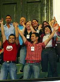 Del bando contrario, integrado por militantes partidistas, miembros de la comunidad lésbico-gay y simpatizantes de las uniones de convivencia, la respuesta era inmediata: "cristiano, amigo, si te persiguen ven conmigo...", "discriminación no, convivencia sí..." y decenas de pancartas, mantas y banderolas con los colores internacionales de su movimieno, que ondeaban al calor de las notas musicales del grupo de reggae Pistache Sound.