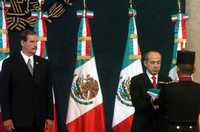 Colocados a la misma altura en un templete que tenía de fondo seis lábaros patrios, la misma voz en off anunció que en ese momento Fox Quesada entregaba a un cadete militar la