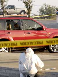 Peritos de Monterrey revisan el estacionamiento de un centro comercial en la colonia Valle Soleado, donde fueron asesinados este jueves cuatro presuntos pistoleros