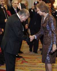 El poeta asturiano Antonio Gamoneda, ayer, cuando es felicitado por la reina Sofía tras recibir el galardón de poesía que lleva el nombre de la monarca
