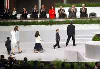 Felipe Calderón Hinojosa, en compañía de su esposa, Margarita Zavala, y sus tres hijos, a su llegada al Auditorio Nacional. Al fondo, los miembros de su gabinete le dan la bienvenida