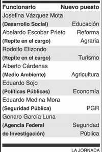 Como dicen los jugadores de dominó: por más que hizo la sopa se quedó con las mismas mulas. Siete secretarios de Estado, o ex secretarios, o altos funcionarios del inolvidable (¡gulp!) gobierno del cambio, repiten en la nómina de Felipe Calderón, entre ellos Eduardo Medina Mora, ex secretario de Seguridad Pública reciclado como procurador general de Justicia, y Genaro García Luna, ex director de la AFI y hoy secretario de Seguridad Pública. Supuestamente son expertos en esa materia. Entonces, ¿por qué Calderón les da un plazo de tres meses para que presenten ooootro plan? Medina Mora es corresponsable del fracaso del cacareado México Seguro, en su versión original y la plus. ¿De veras necesitan tanto tiempo para replantearlo? ¿Qué cosas nuevas irán a inventar? Los malpensados comentan que la presencia de Medina Mora en la PGR tiene como fin cuidarle las espaldas a don Vicente exSpot, a Marta Sahagún y sus hijos, y a los empresarios del Fobaproa. Ligado a Televisa, es hermano del director general de Banamex, Manuel Medina Mora, el banco que pasó de manos de Roberto Hernández a Citibank sin pagar impuestos. Estos son los funcionarios clonados del foxismo al nuevo gobierno: