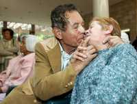 Una pareja de enamorados festejó así la reapertura del Jardín de la Tercera Edad, ayer en el Bosque de Chapultepec
