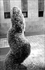 ?, le habrá dicho alguien). Lo digo porque a veces el venado parece pato y la canasta, venado. En esas figuras un poco forzadas se puede percibir una lucha con el arbusto que insiste en defender su forma a toda costa: si yo estoy hecho para parecer garza, ¿por qué insisten en que me vea cual bisonte? O bien es muy difícil distinguir qué es esa bolita recortada a la que le salen ramas por todos lados: patas, picos, cuernos mitológicos y tantito chacoteros, si se me permite el adjetivo. En este caso, me temo que son los propios jardineros los que toman la determinación estética, repasando listas entre sueños que se han vuelto a la larga un poco absurdas: pato, canasta, venado, venado, dinosaurio, estafilococo