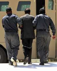Saddam Hussein al ser conducido al tribunal especial, el primero de julio de 2004