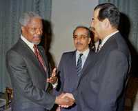 Saddam Hussein saluda al secretario general de la ONU, Kofi Annan, el 22 de febrero de 1998, durante una visita a la sede del organismo