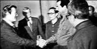 Imagen de video de Donald Rumsfeld y el entonces presidente tomada el 20 de diciembre de 1983, cuando el líder iraquí era el mandatario consentido del gobierno de Estados Unidos