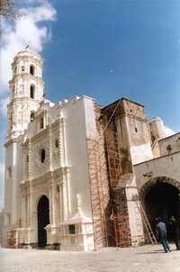 Fachada de la iglesia de Coatlinchán, durante las labores de restauración