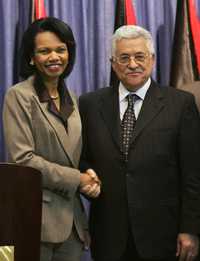 La secretaria de Estado de Estados Unidos, Condoleezza Rice y el presidente palestino Mahmoud Abbas, antes de la conferemcia de prensa en la oficina del segundo, en la ciudad cisjordana de Ramallah
