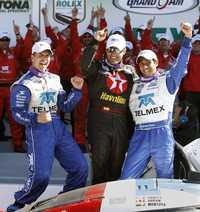 El estadunidense Scott Pruett, el colombiano Juan Pablo Montoya y el mexicano Salvador Durán festejan el triunfo en la competencia de Florida