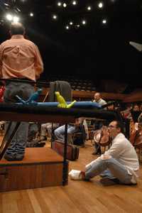 Sentado en el piso, Leonardo Mortera, narrador en el programa que interpretará la filarmónica