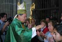 El cardenal Norberto Rivera Carrera saluda a los asistentes a la misa de este domingo en la catedral Metropolitana
