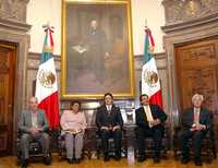 El jefe del GDF, Marcelo Ebrard, al centro, durante la presentación de cuatro nuevos secretarios, ayer, en el salón de cabildos, en el Antiguo Palacio del Ayuntamiento