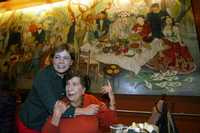 Guadalupe Rivera Marín (hija de Diego Rivera), en primer plano, y Marcela Briz, en el restaurante El Cardenal del hotel Sheraton Alameda. Al fondo, la reproducción de un mural pintado por el artista de quien este 2007 se cumplen 50 años de su fallecimiento