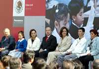 El secretario general del SNTE, Rafael Ochoa; la titular de la SEP, Josefina Vázquez Mota; y el presidente Felipe Calderón, con los niños premiados de la prueba Enlace