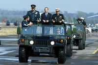 El jefe del Ejecutivo llegó a la base militar en un helicóptero y luego abordó un vehículo Humvee que lo trasladó a la plataforma sur del campo militar 37-D. Flanqueado por los secretarios de la Defensa Nacional y de Marina, Guillermo Galván Galván y Mariano Francisco Saynez Mendoza, respectivamente, hizo un recorrido por la exhibición estática de material de vuelo de la FAM. Enseguida saludó a la Bandera y se dirigió al presídium, donde ya se encontraban el gobernador del estado de México, Enrique Peña Nieto, y el secretario de Comunicaciones y Transportes, Luis Téllez.