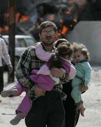 Un iraquí huye con su familia del sitio donde ayer explotó en Bagdad un coche bomba. Más tarde ocurrió otro ataque del que resultaron dos muertos y varios heridos