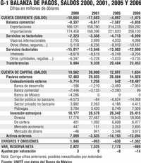El pasado 23 de febrero el Banco de México dio a conocer la Balanza de Pagos en 2006, esto es, la cuenta síntesis de las transacciones económicas de México con el exterior. En ese año, la Cuenta Corriente registró un déficit de únicamente -1 mil 475 millones de dólares y la Cuenta de Capital un superávit de 1 mil 834 millones; la diferencia de 359 millones, adicionada a una disminución en las Reservas Internacionales por -1 mil 003 millones (-989 de reserva directa y -14 por ajuste de valoración), nos dan como cifra de ajuste un saldo negativo en Errores y Omisiones por -1 mil 362 millones de dólares (Gráfico 1).