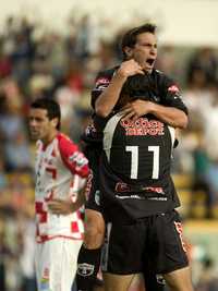 El tuzo Juan Carlos Cacho (11) festeja con su compañero Christian Giménez el gol tempranero que le anotó a las Aguilas