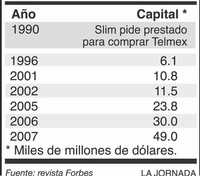 En sólo tres sexenios -Salinas de Gortari, Zedillo y Fox-, el magnate de las telecomunicaciones, el tabaco, los restaurantes, las carreteras, los aeropuertos, y últimamente hasta de las plataformas petroleras, amasó una fortuna que este año la revista Forbes estima en 49 mil millones de dólares. Es posible que el año próximo se convierta en el más rico de todos, ya que Bill Gates, el número uno, con 57 mil millones, y el número dos, Warren Buffett, con 52 mil millones de dólares, están repartiendo su fortunas a causas altruistas, principalmente salud y educación de países subdesarrollados.
