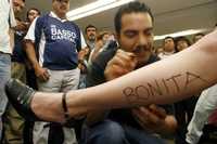 Algunas de las frases plasmadas en la piel fueron: Eres muy bella nena, Estás vien uena, Aquí estuve, I love you, Eres sensual y hasta Muera Calderón, entre otras palabras se convirtieron en una negra red que simuló oscuras pantimedias.