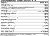 Otro ejemplo, ahora la inversa: de acuerdo con el mismo documento de la SHCP, en 2006 el CNCA dio "donativos" a unas 126 organizaciones que en total ascienden a 305 millones 65 mil 479 pesos.