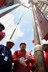 El presidente venezolano, Hugo Chávez, con trabajadores petroleros, en agosto pasado. Hoy Petróleos de Venezuela es una de las superexitosas "nuevas siete hermanas" estatales