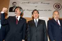 El director del Instituto Politécnico Nacional, Enrique Villa Rivera; Cuauhtémoc Cárdenas y José Luis Fonseca, del Consejo Nacional de Egresados del IPN, ayer durante el desayuno en el que se entregó la medalla Amalia Solórzano viuda de Cárdenas a alumnos y académicos destacados. La imagen, al grito del huelum de la porra politécnica
