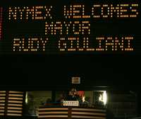 El ex alcalde de Nueva York Rudolph Giuliani en un discurso después de la campanada de inicio de sesiones de la bolsa de valores local