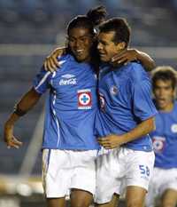 El zaguero Huiqui festeja con Borgetti su anotación a los felinos