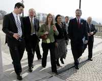 El líder del Sinn Fein, Gerry Adams (extremo derecho), y el jefe negociador del partido nacionalista, Martin McGuinness (segundo del lado izquierdo) al llegar a la sede del Parlamento en Belfast, Irlanda del Norte, acompañados por varios legisladores