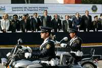 El jefe de Gobierno del DF, Marcelo Ebrard, junto al titular de la Secretaría de Seguridad Pública capitalina durante la puesta en marcha de una unidad de protección ciudadana, en Balbuena