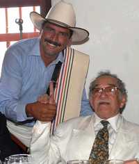 El escritor Gabriel García Márquez y Carlos Castañeda, de la Federación Nacional de Cafetaleros de Colombia, este lunes, después de comenzar el Congreso de la Lengua Española, en Cartagena