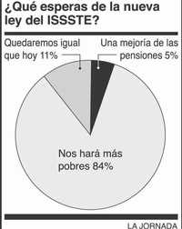 Los líderes de la burocracia no consultaron con las bases el contenido de la nueva Ley del ISSSTE, que esta semana terminó de aprobarse en el Senado después que fue autorizada por la Cámara de Diputados. En un sondeo que hicimos entre empleados públicos, 96 por ciento contestó que no se le preguntó su opinión y 84 por ciento está convencido de que la nueva legislación los hará más pobres.