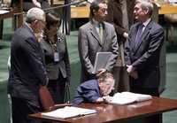 El presidente del Conapred, Gilberto Rincón Gallardo, firma el documento de la convención y su protocolo facultativo en la sede de Naciones Unidas, en Nueva York