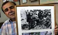 José Luis Aparicio, veterano de la guerra de las Malvinas, muestra una foto de él y sus compañeros tras ser capturados por tropas británicas el 12 de junio de 1982