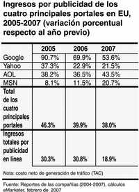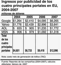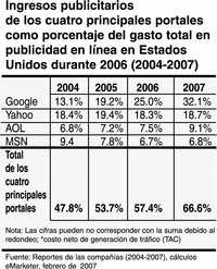 eMarketer calcula que los ingresos netos de Yahoo!, AOL, MSN y Google por publicidad representaron 57.4% del gasto total en Internet en Estados Unidos durante 2006. (Ver gráfica 1)