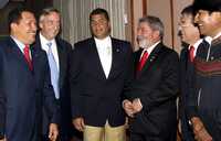 Los presidentes de Venezuela, Hugo Chávez; de Argentina, Néstor Kirchner; de Ecuador, Rafael Correa; de Brasil, Luiz Inacio Lula da Silva; de Paraguay, Nicanor Duarte, y de Bolivia, Evo Morales, posan antes de la apertura de la cumbre, en la venezolana Isla Margarita