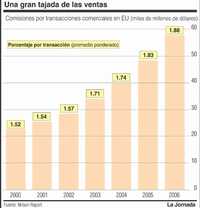 De acuerdo con un informe de la revista especializada en comercio Nilson Report, los establecimientos de Estados Unidos pagaron el año pasado 56 mil millones de dólares en comisiones por pagos con tarjeta (ver tabla), más del doble de lo erogado cinco años antes. Los pequeños negocios fueron los que más resintieron este incremento. Celent, consultora de instituciones financieras, calcula que, para un negocio cuyas ventas ascienden a un millón de dólares al año, las comisiones por pago con tarjetas se han incrementado, en promedio, 16 por ciento anual desde el año 2000.