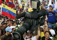 Caracas, 21 de abril. Miles de opositores marcharon hoy por calles de la capital de Venezuela, hasta la sede de la privada Radio Caracas Televisión (RCTV), en protesta por la decisión del gobierno del presidente Hugo Chávez de no renovar la concesión a la cadena por su apoyo al fugaz golpe de Estado de abril de 2002.